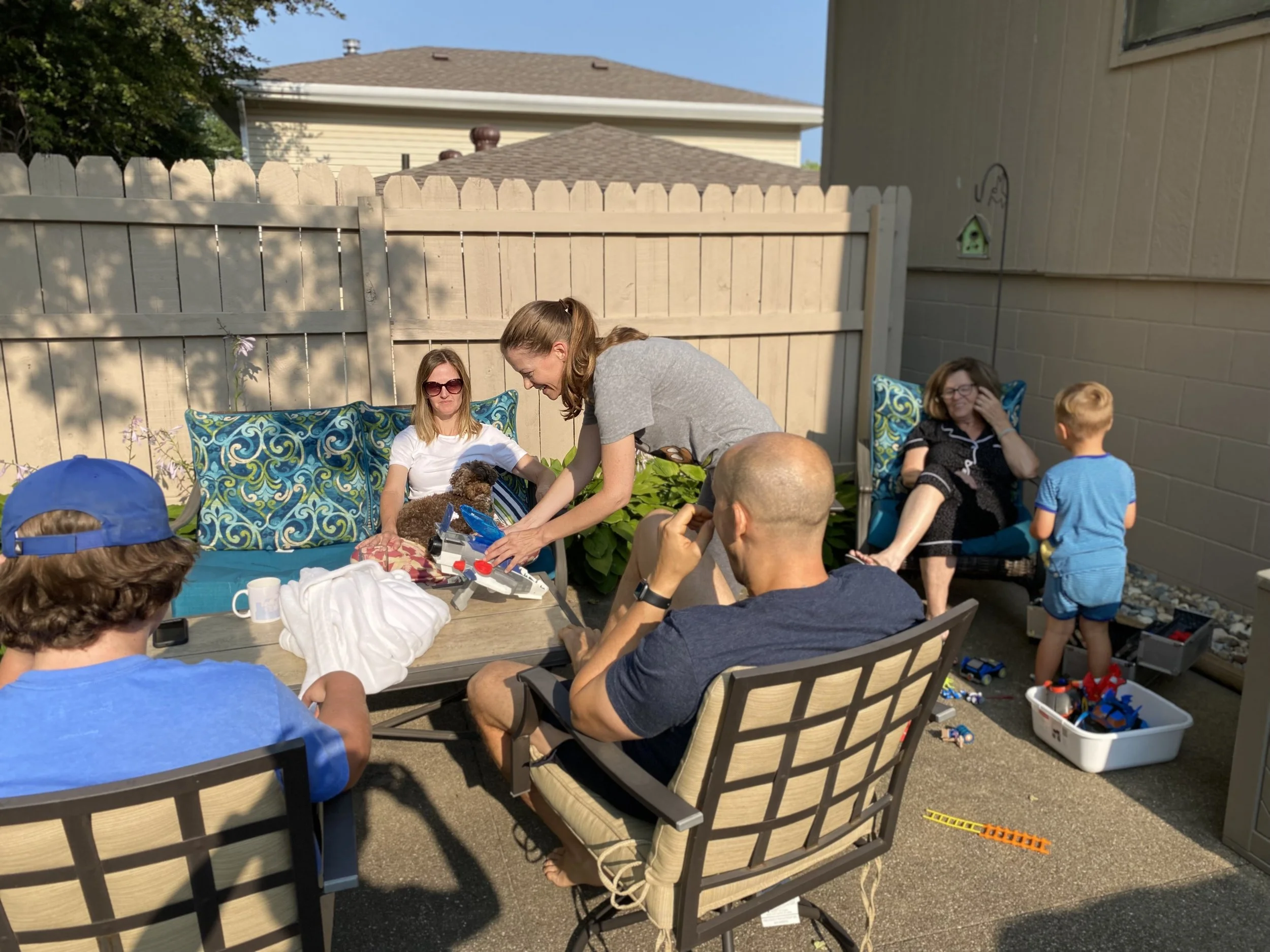 Joy's family in Grandma's backyard (sisters, nephew, Grandma). Family is super important to us, and we have such great memories together.