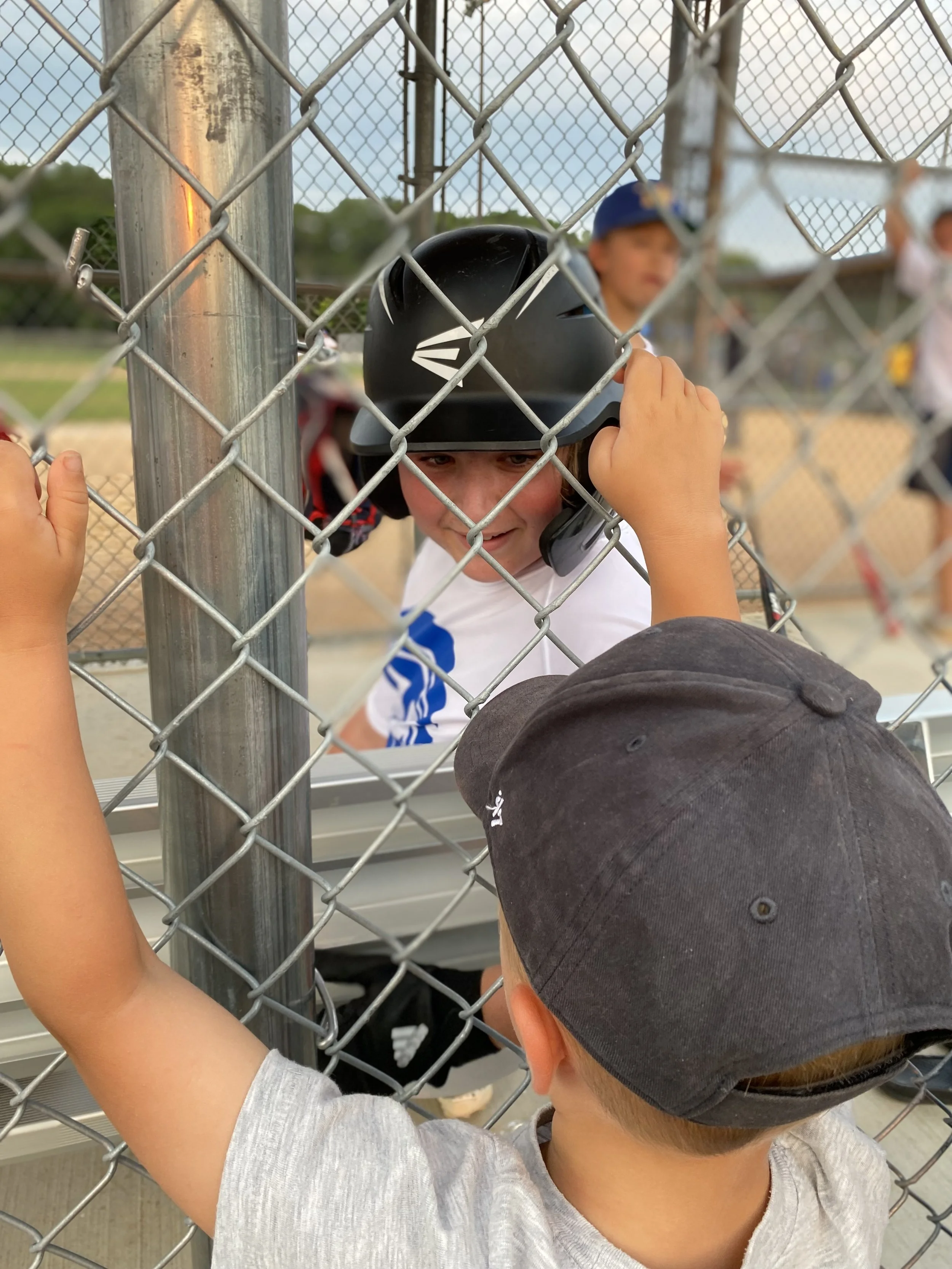 Our son looking up to his big cousin in the dugout. We love sports, and also cheering for those we love!